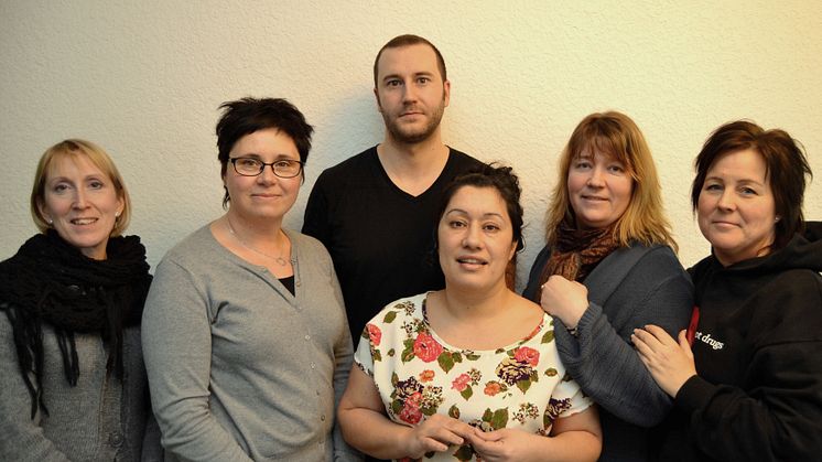 Från vänster står Anette Englund, fritidsgården Gluggen i Bureå, Anette Forss, fritidsgården Söder i Skellefteå, Marcus Lundström, fritidsgården Loftet i Skellefteå, Johanna Storfält, fritidsgården Klippan i Bergsbyn, Susanne Oderth, fritidsgården Grottan i Ursviken och Anna Holmqvist, fritidsgården Källar´n i Skelleftehamn.