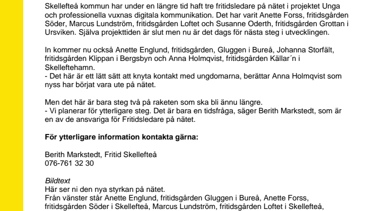 Skellefteå kommun har under en längre tid haft tre fritidsledare på nätet i projektet Unga och professionella vuxnas digitala kommunikation. Det har varit Anette Forss, fritidsgården Söder, Marcus Lundström, fritidsgården Loftet och Susanne Oderth, fritidsgården Grottan i Ursviken. Själva projekttiden är slut men nu är det dags för nästa steg i utvecklingen.